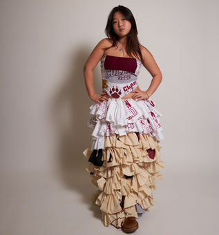 A dress made from donated Horace Mann School merchandise (handkerchiefs, tote bags, shirts, etc)
